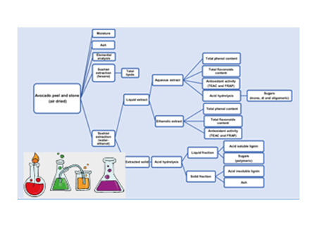 Para un mejor aprovechamiento del aguacate, es importante reconocer qué compuestos contienen la cáscara y el hueso y cuáles se puede convertir en bioproductos valiosos. Durante la investigación se determinó la composición química, el contenido fenólico total por el método Folin-Ciocalteu y las propiedades antioxidantes por los ensayos FRAP y TEAC. Ambas biomasas contienen lípidos y proteínas. La valorización de lignina y azúcares es de interés dado el alto contenido, en particular del hueso es una rica fuente de glucosa, que podría utilizarse para obtener biocombustibles o derivados de interés